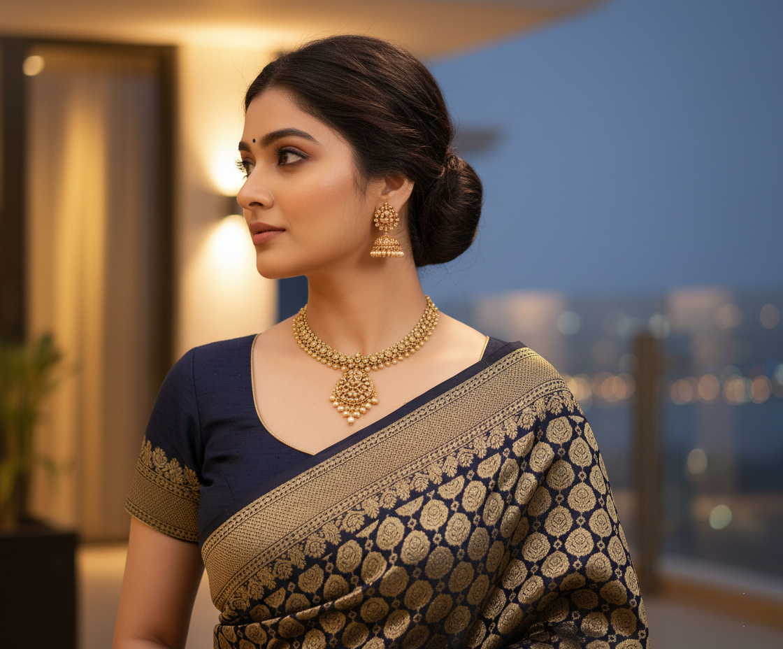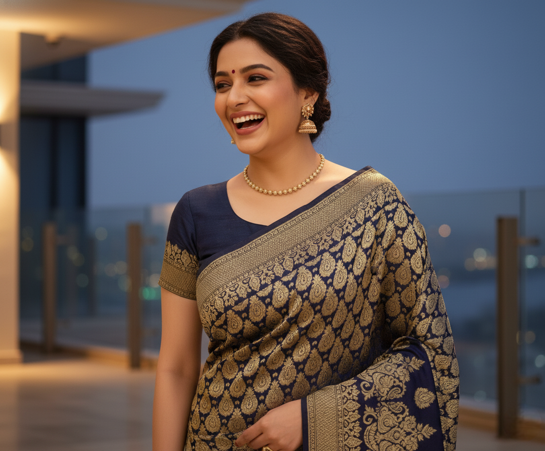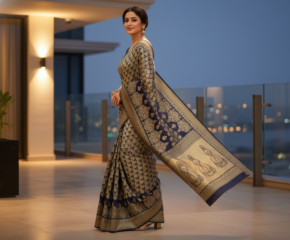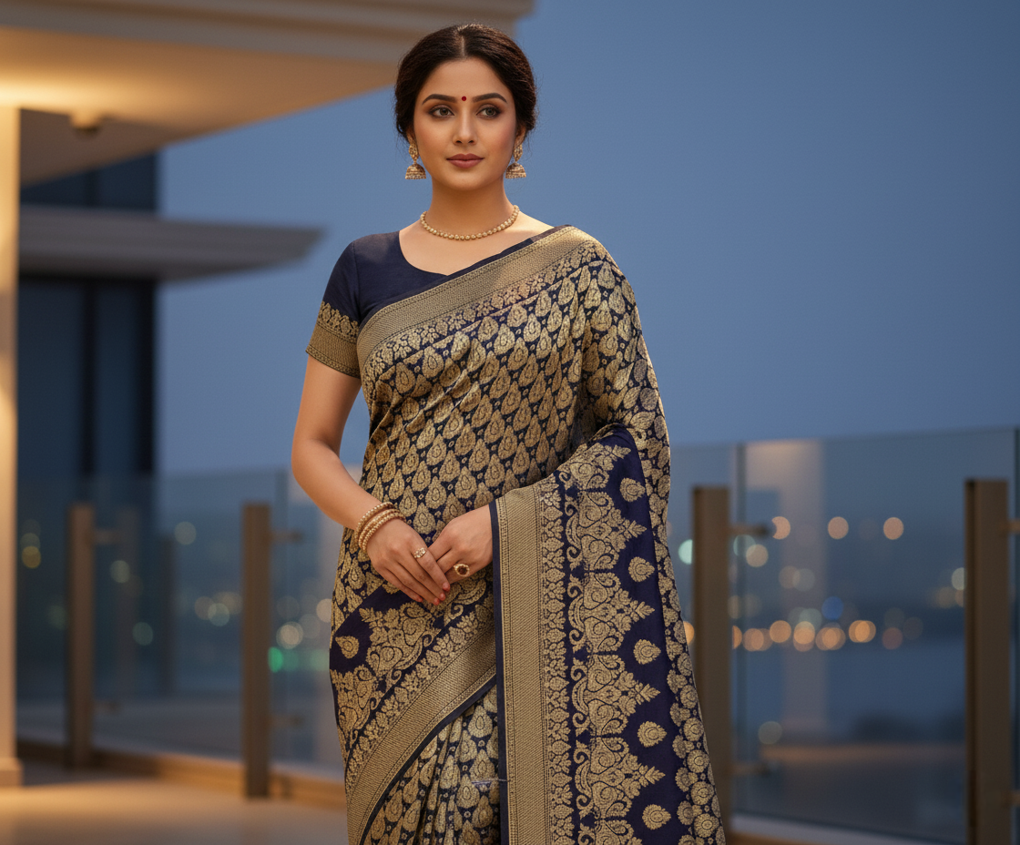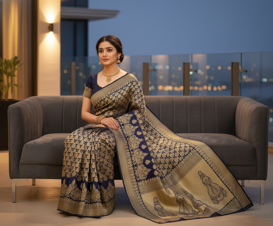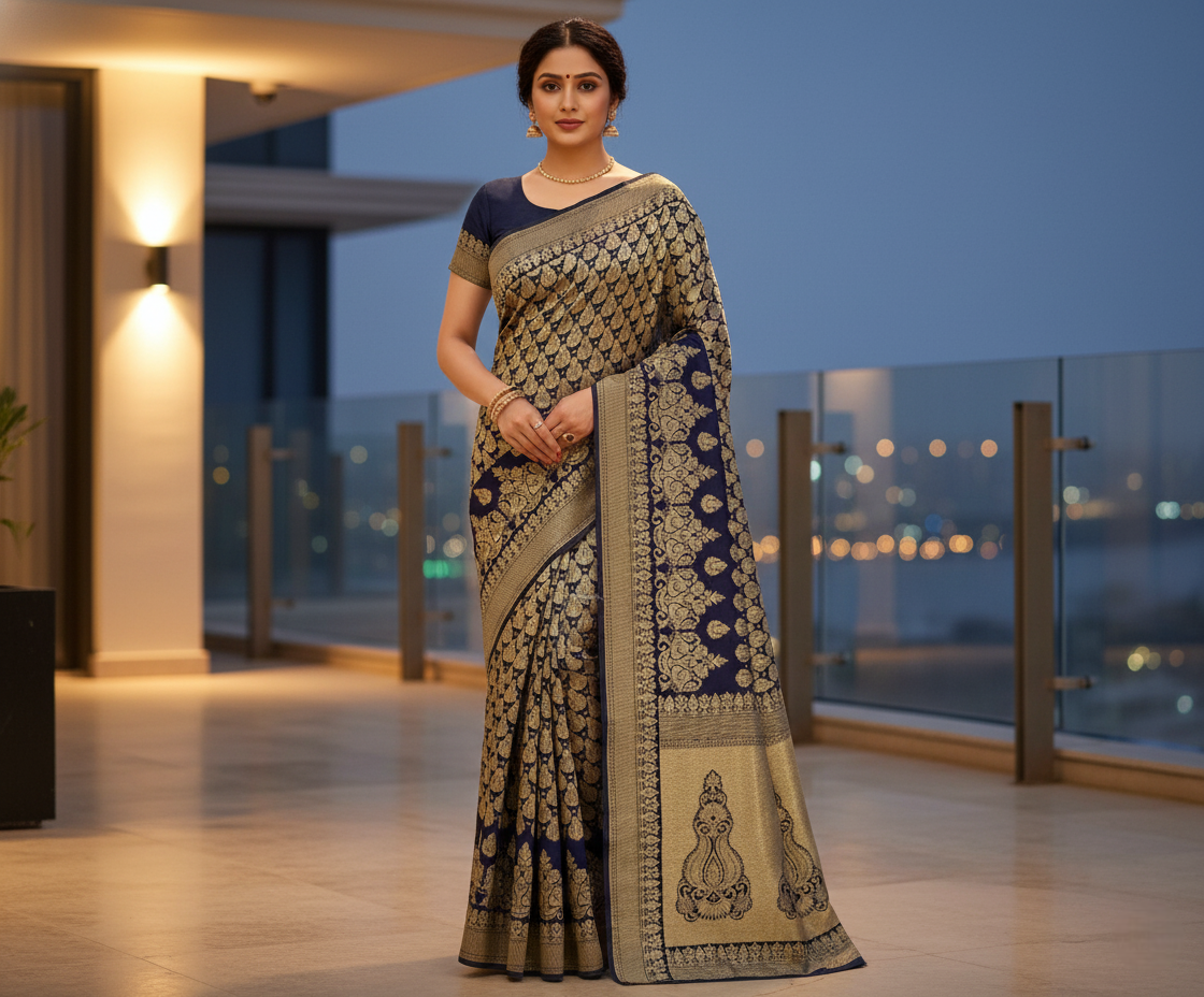 Navy Blue Jacquard Silk Kanjivaram Saree With Blouse