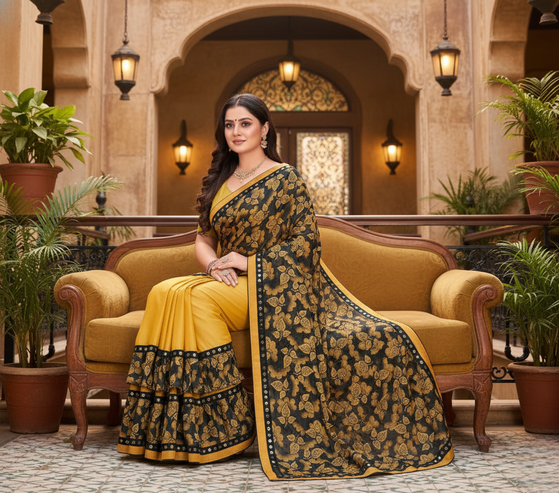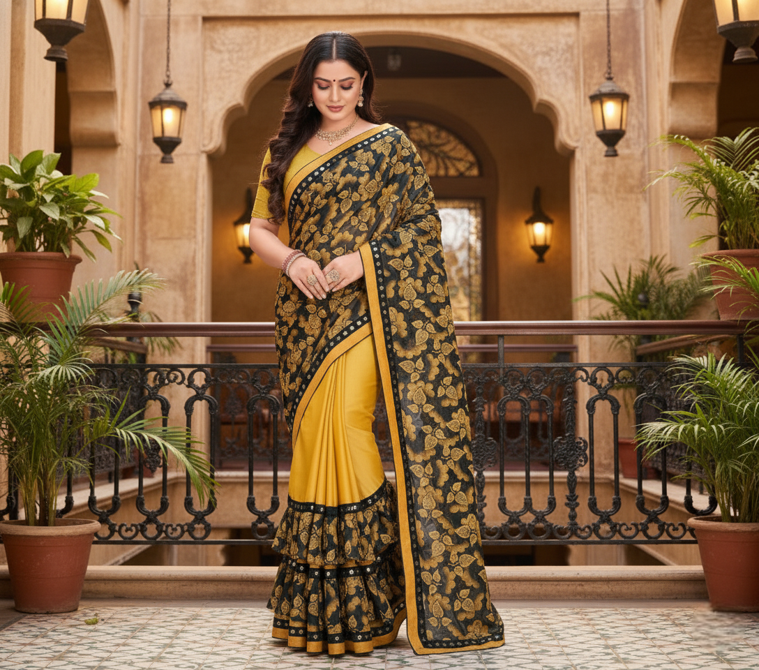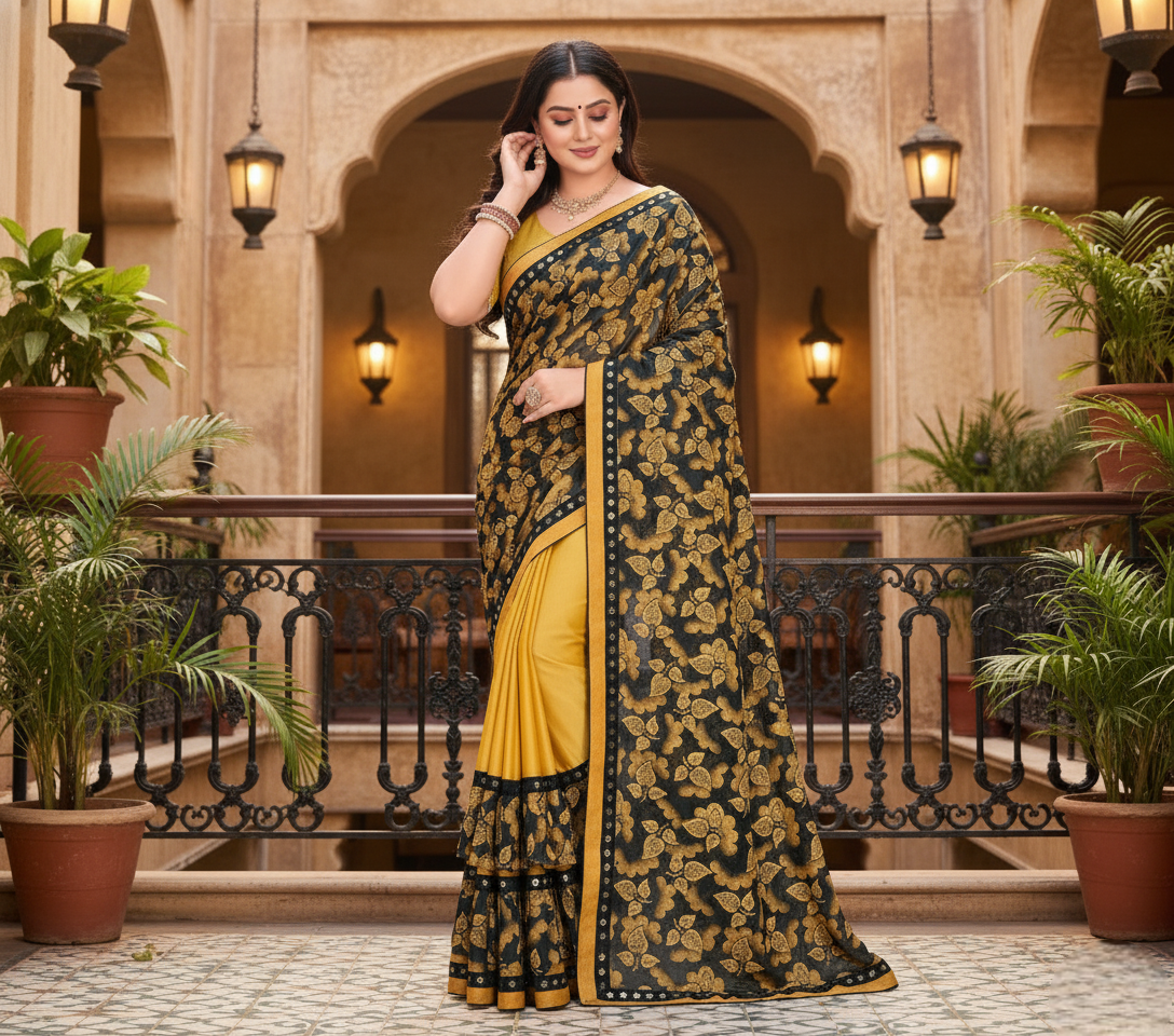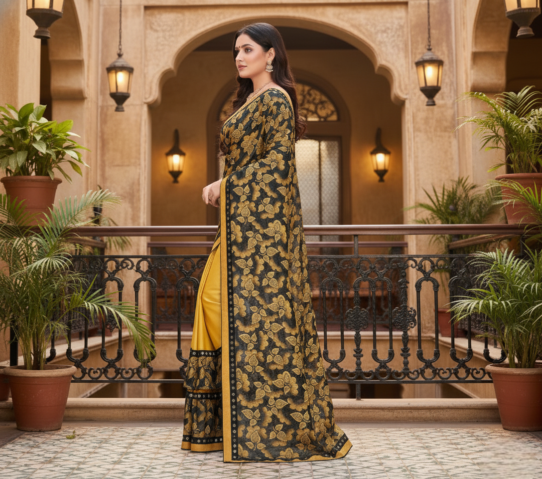 Mustard Floral Print Lycra Blend Saree