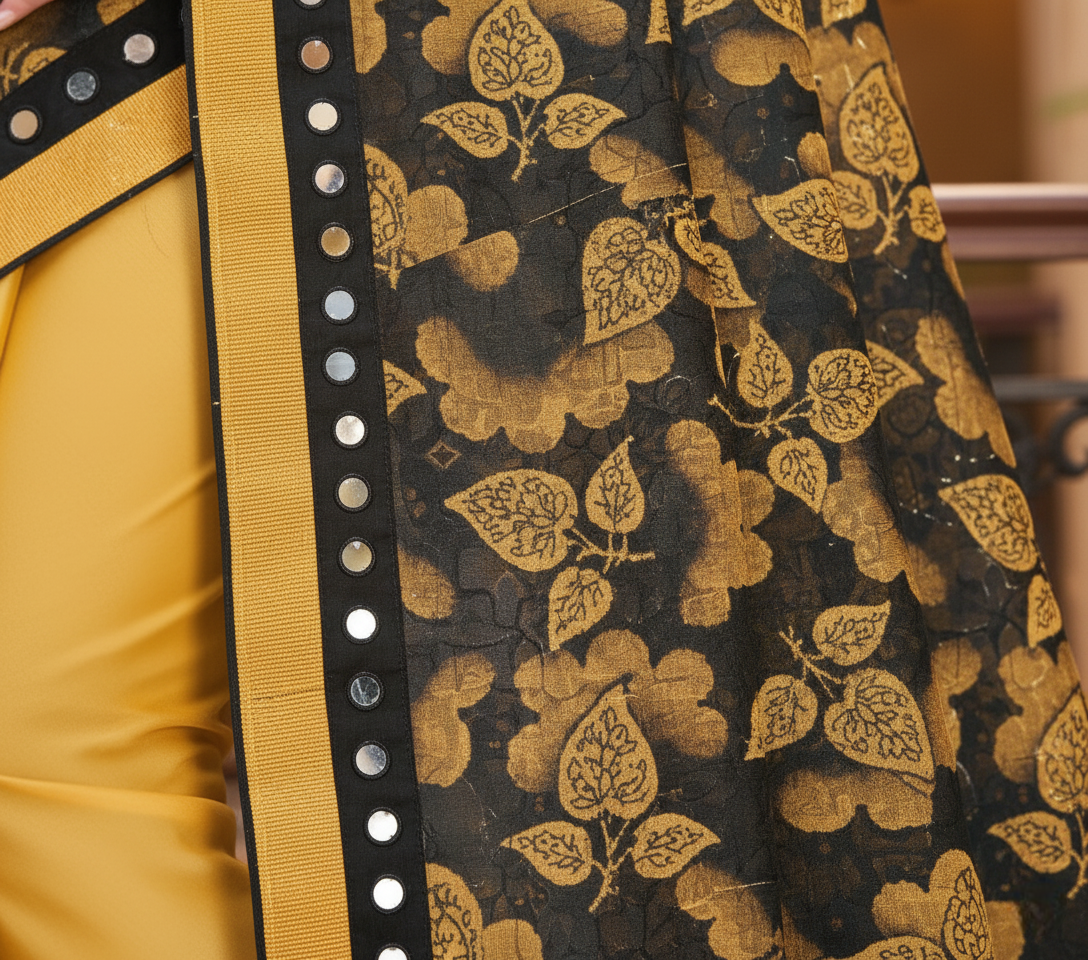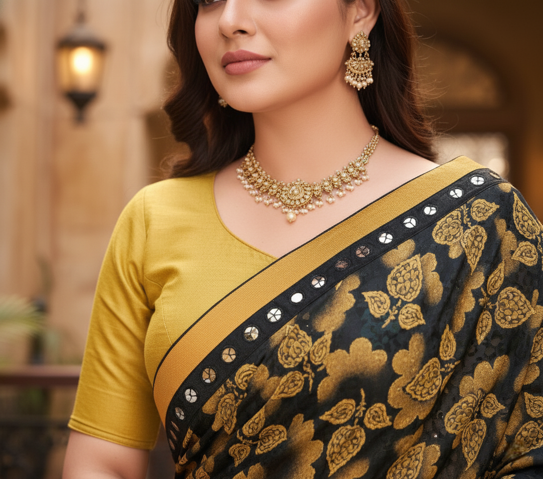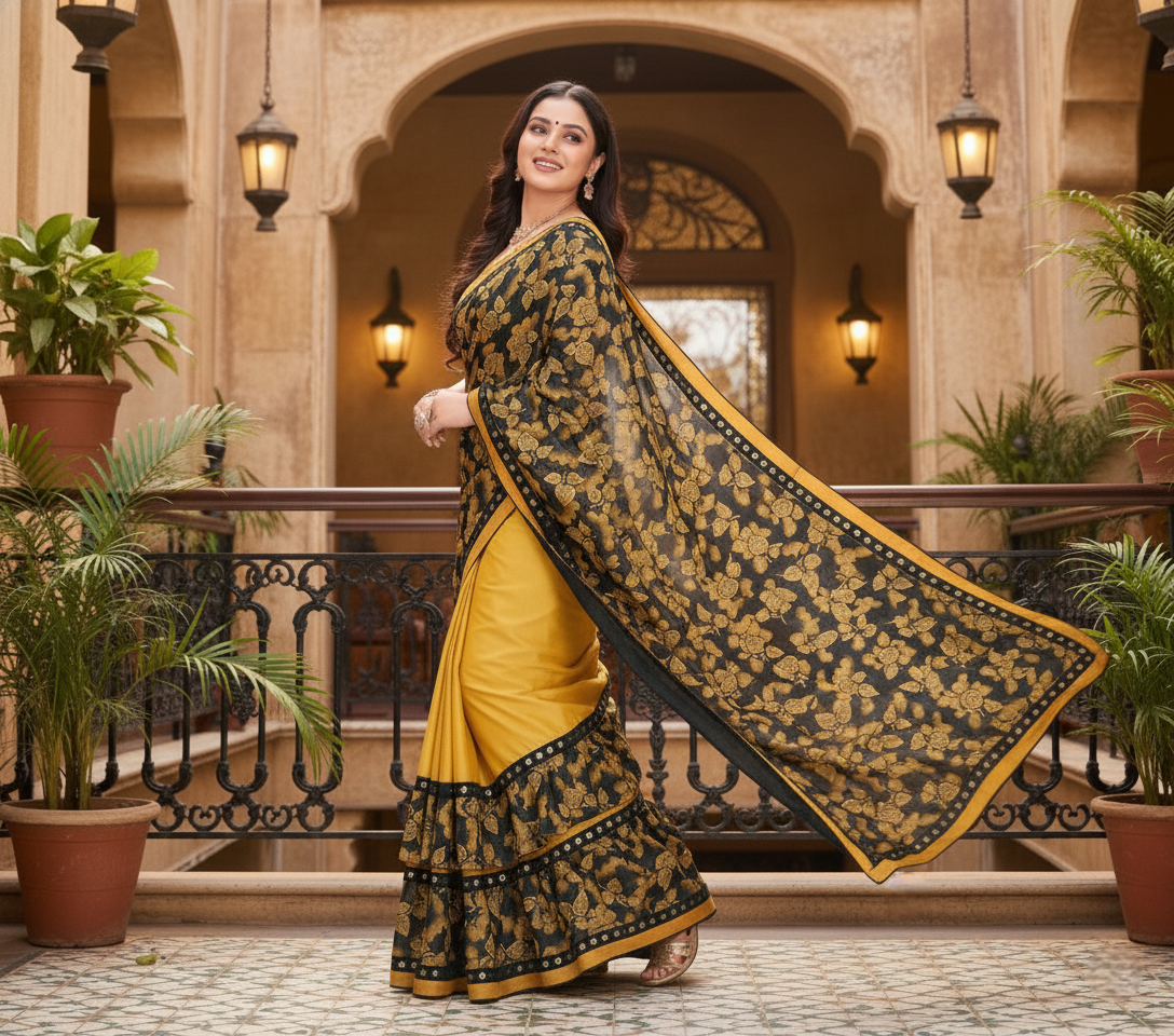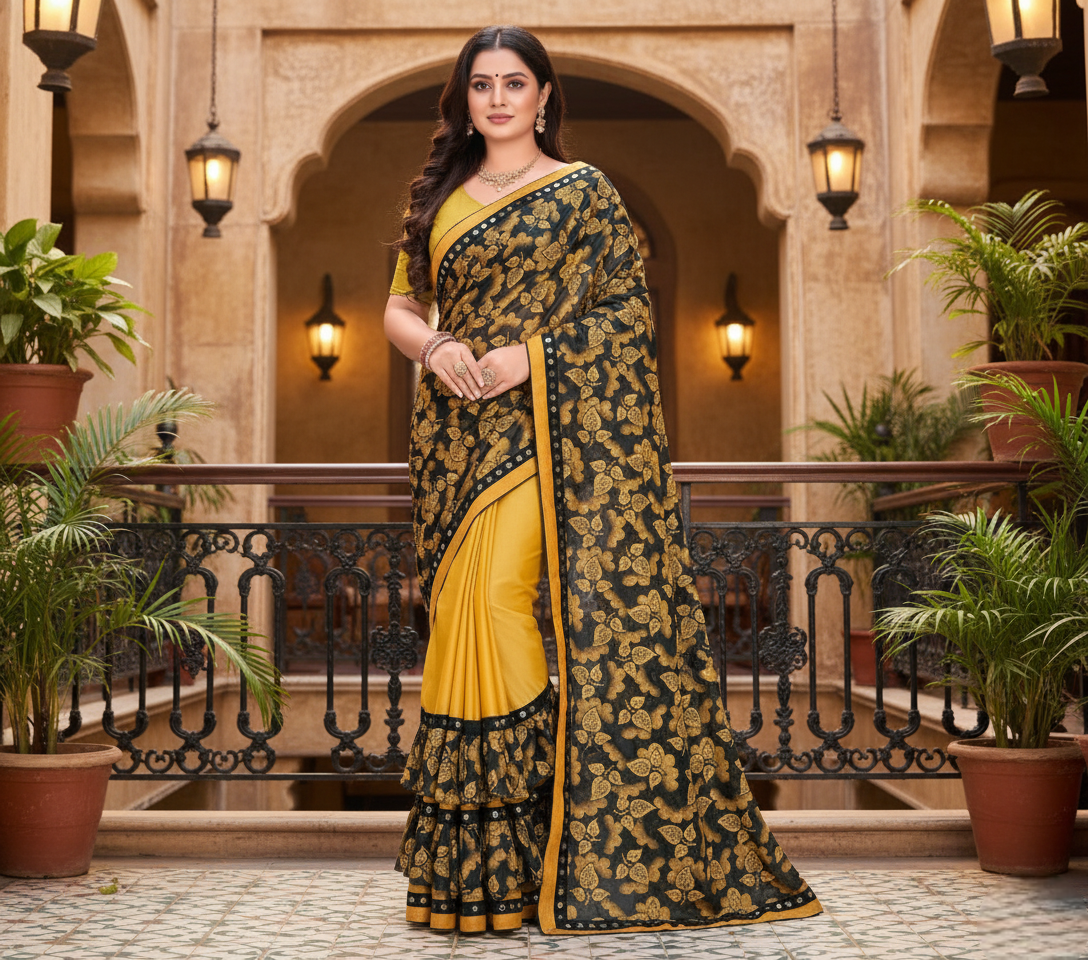 Mustard Floral Print Lycra Blend Saree
