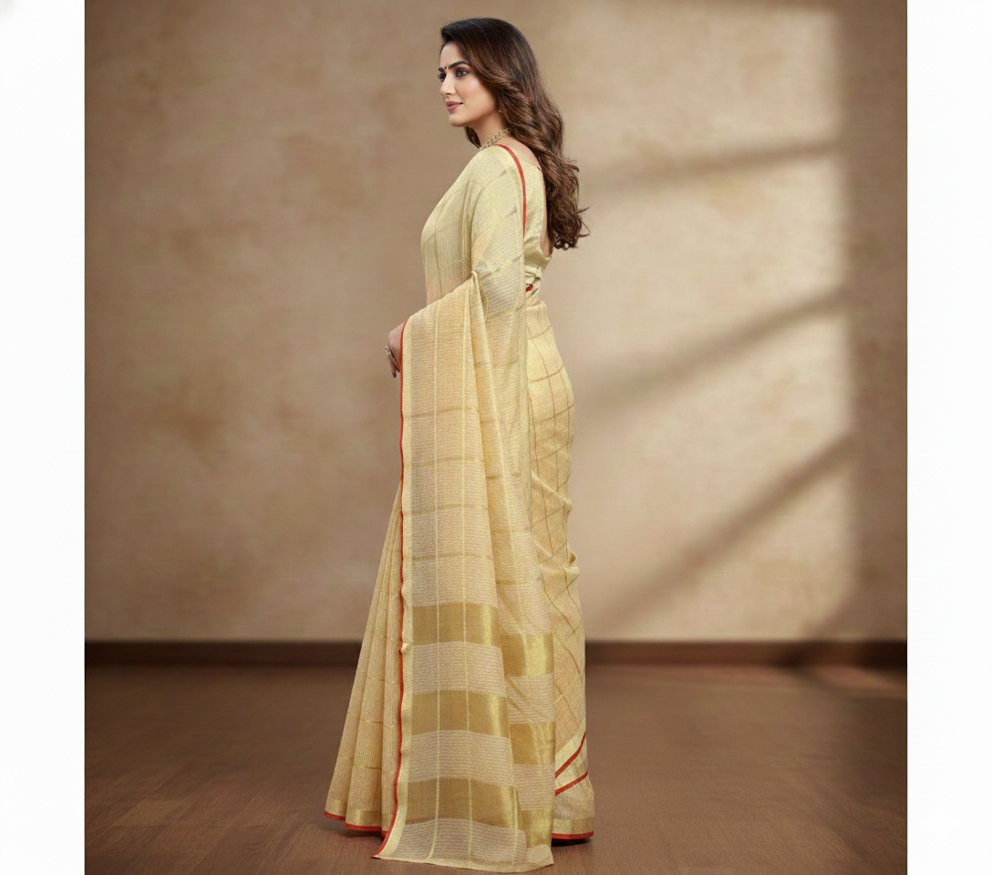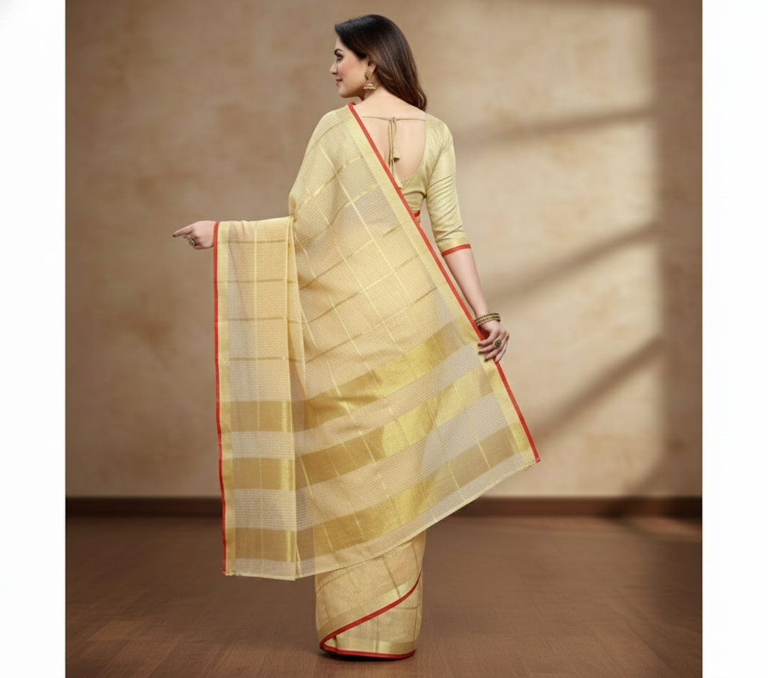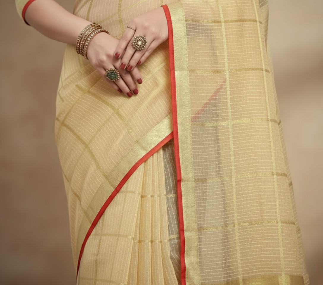 Beige Kota Doria Cotton Checked Saree