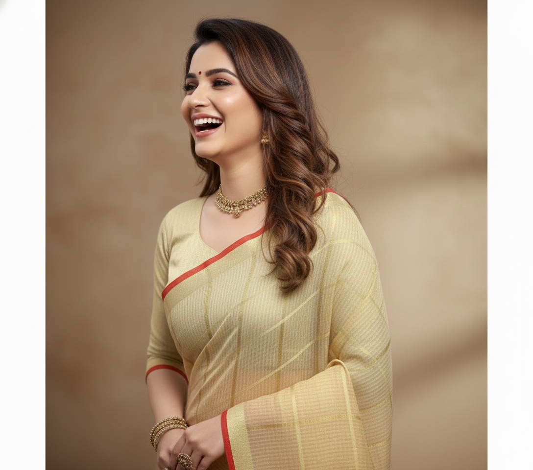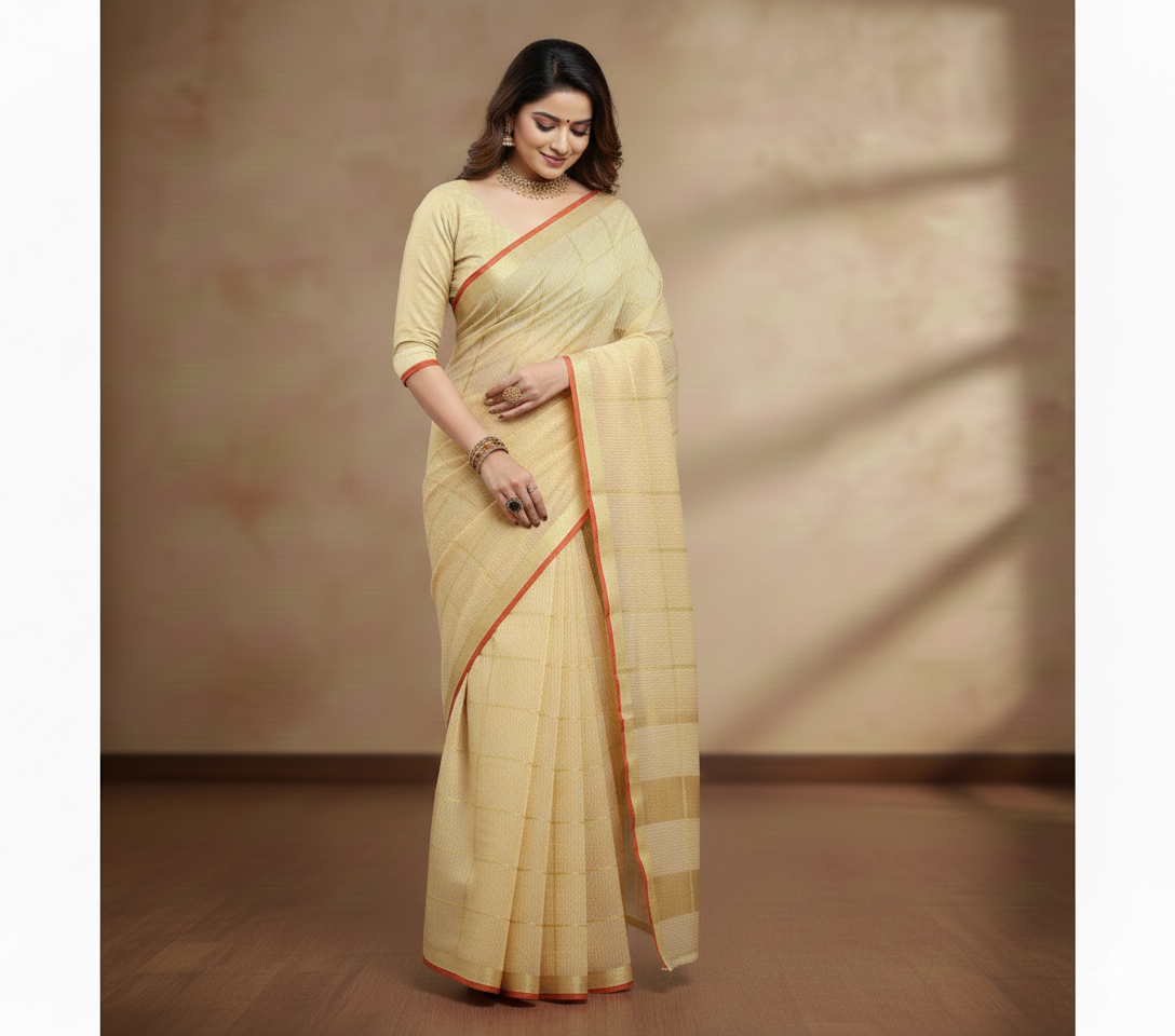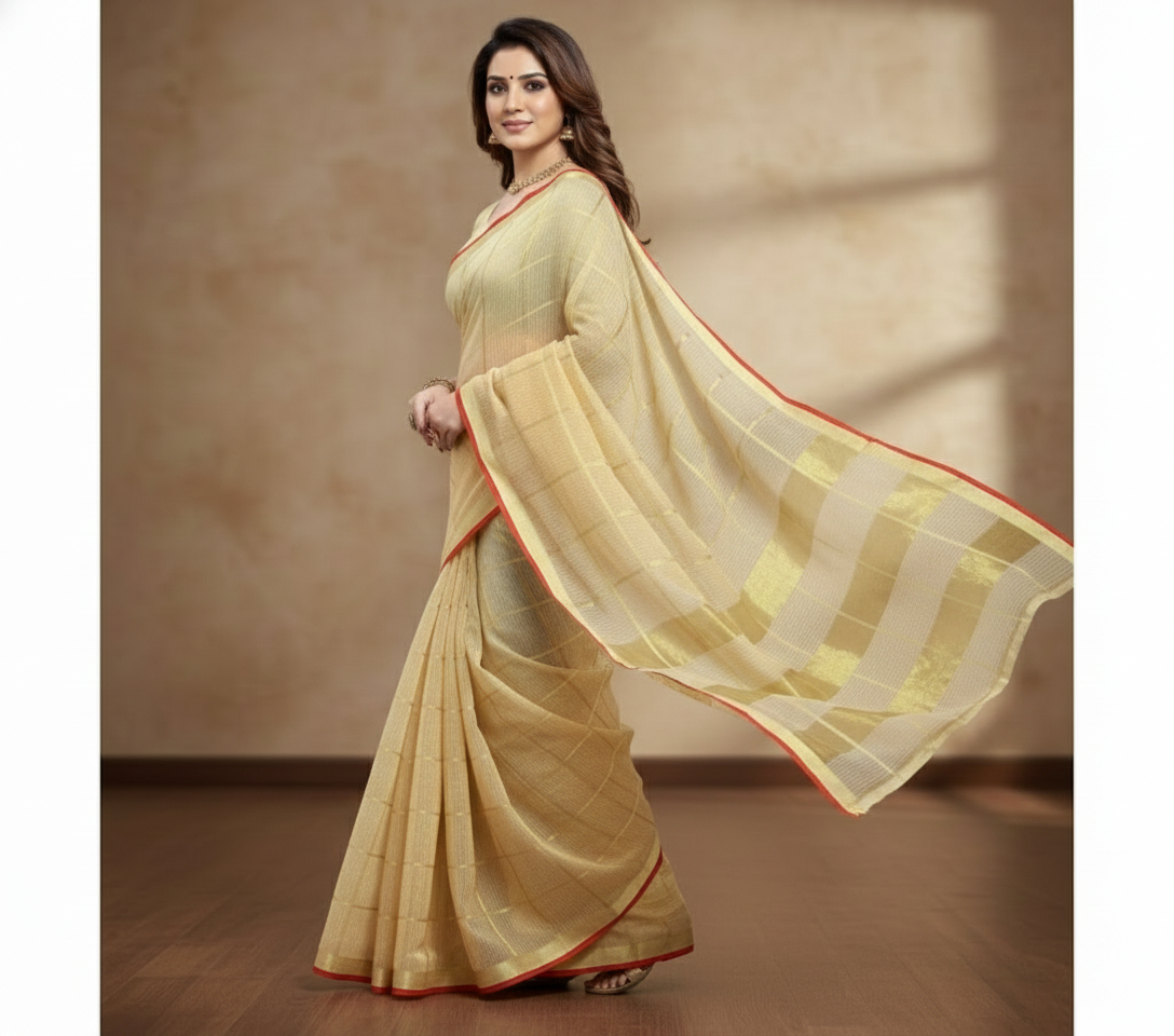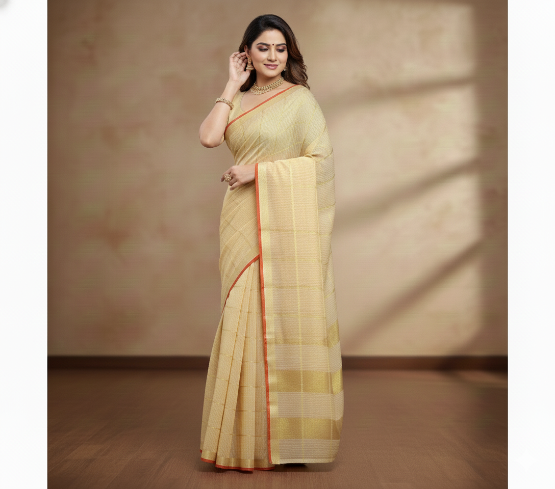 Beige Kota Doria Cotton Checked Saree