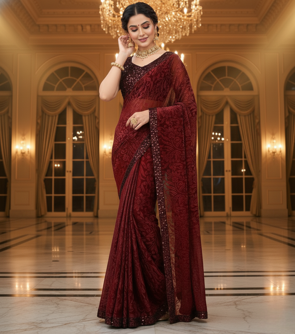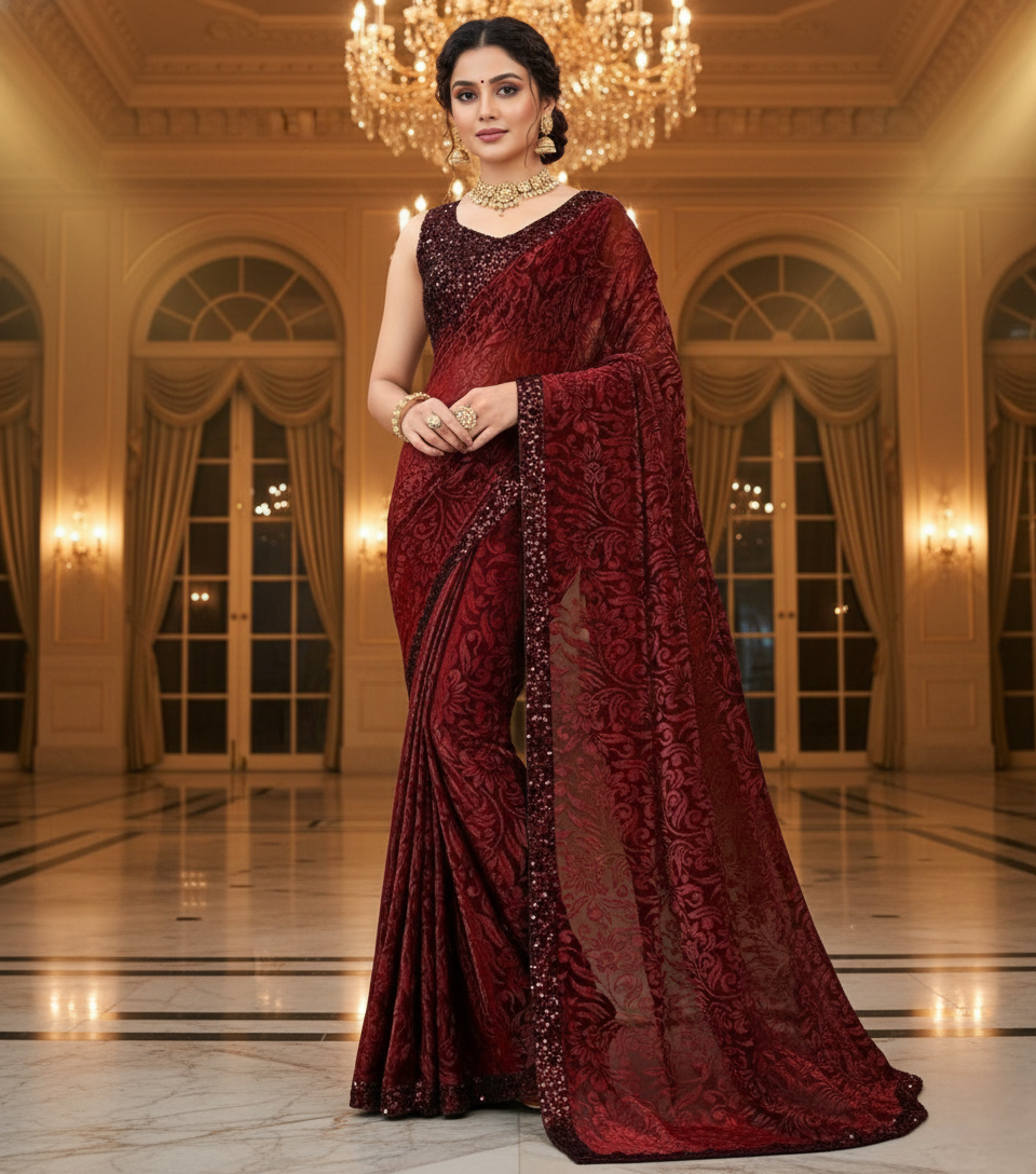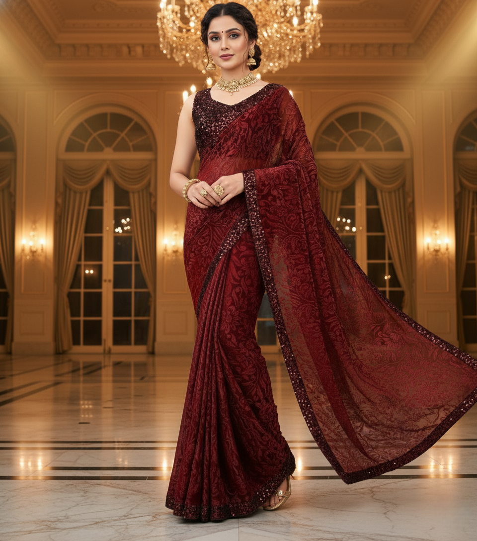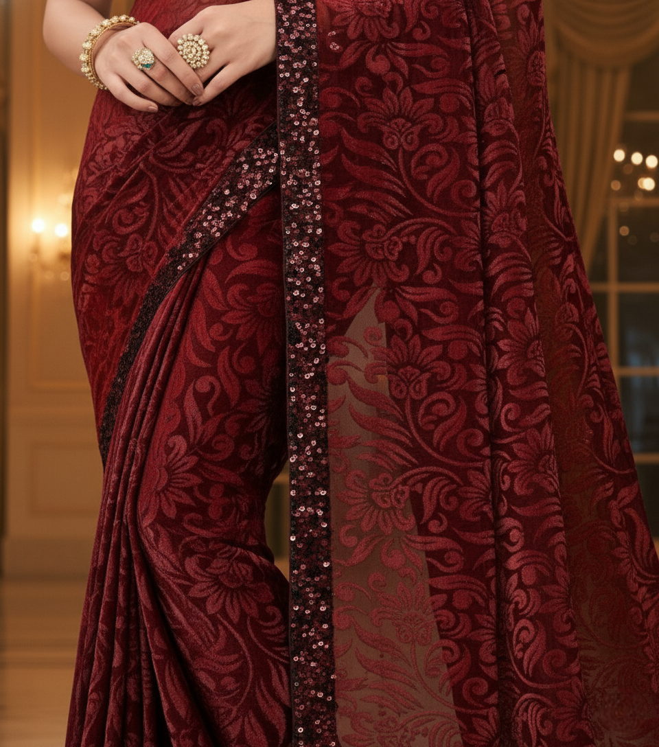 Maroon Lycra Floral Saree