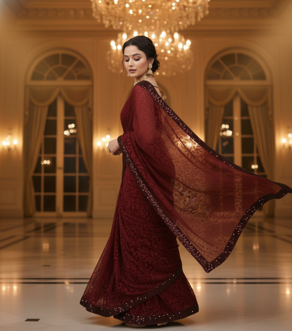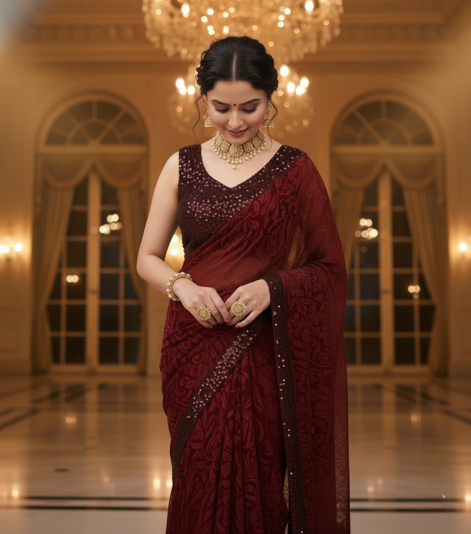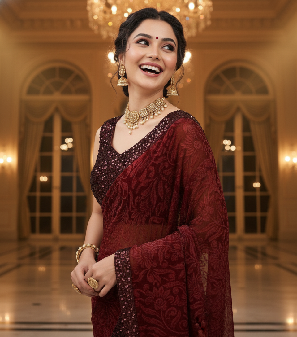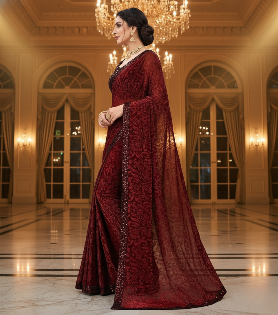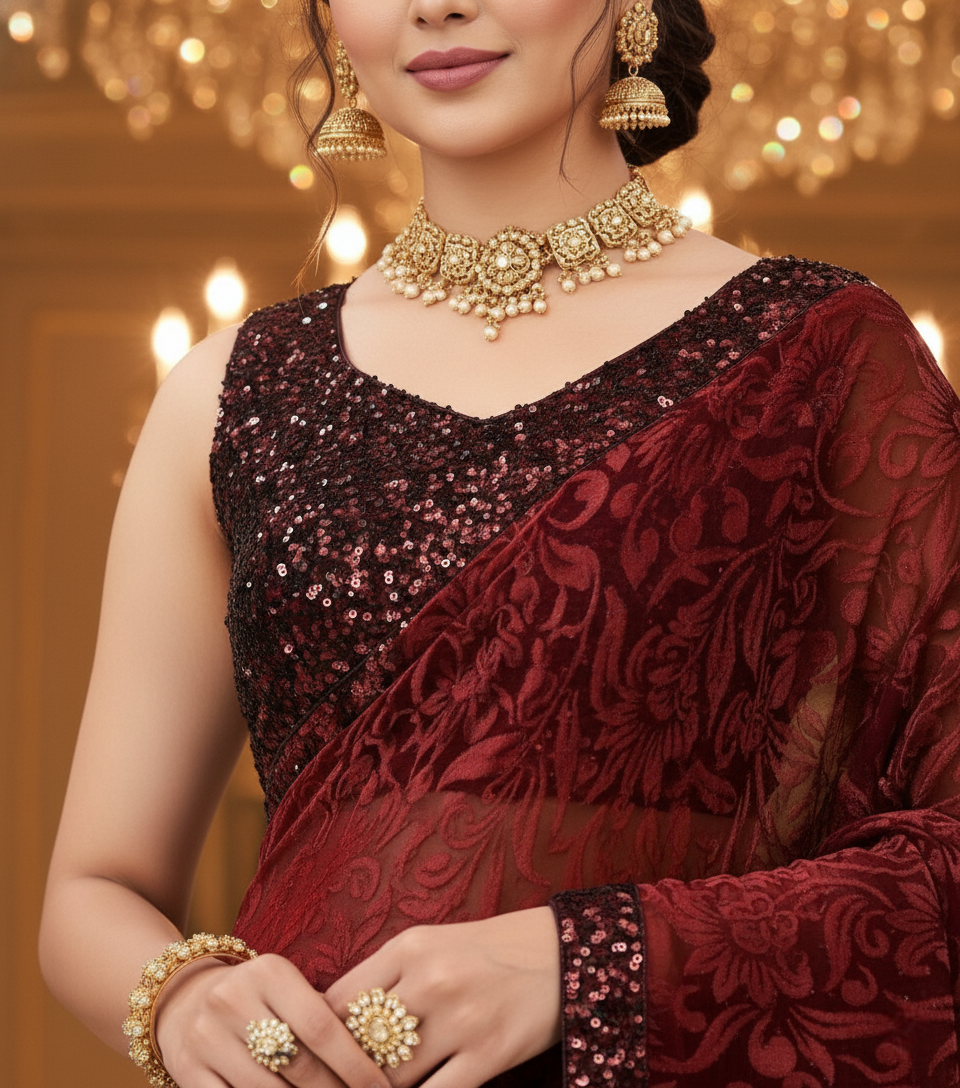 Maroon Lycra Floral Saree