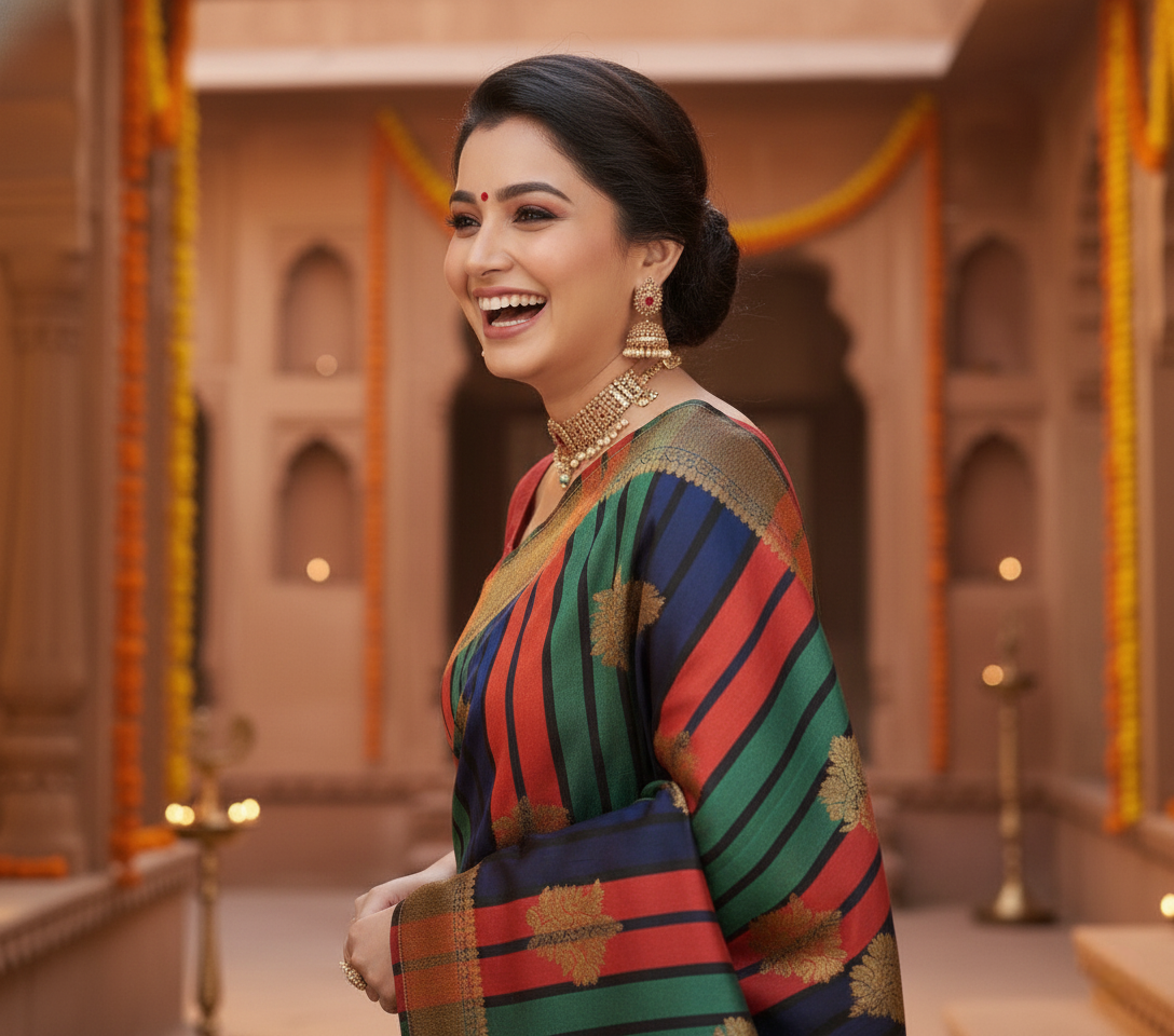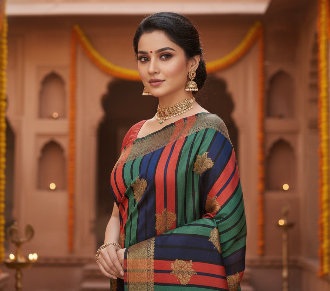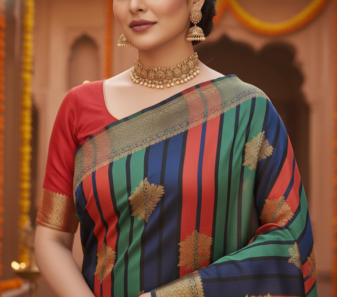 Saree Work: Rich Zari Weaving with Multicolor Striped Pattern and Floral Motifs