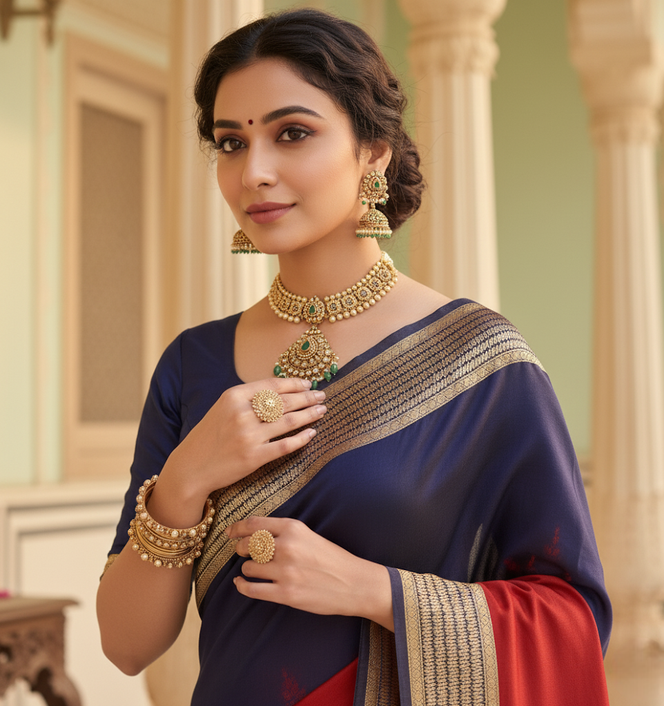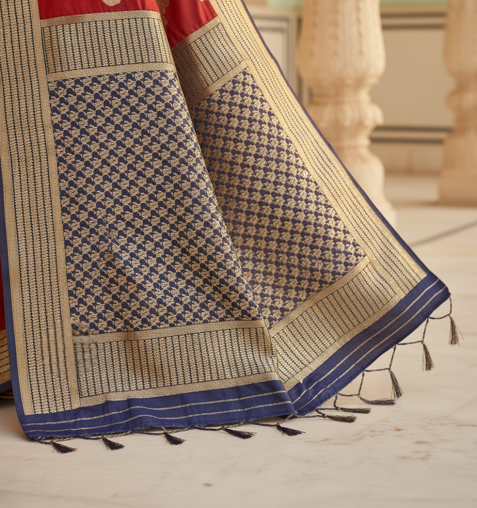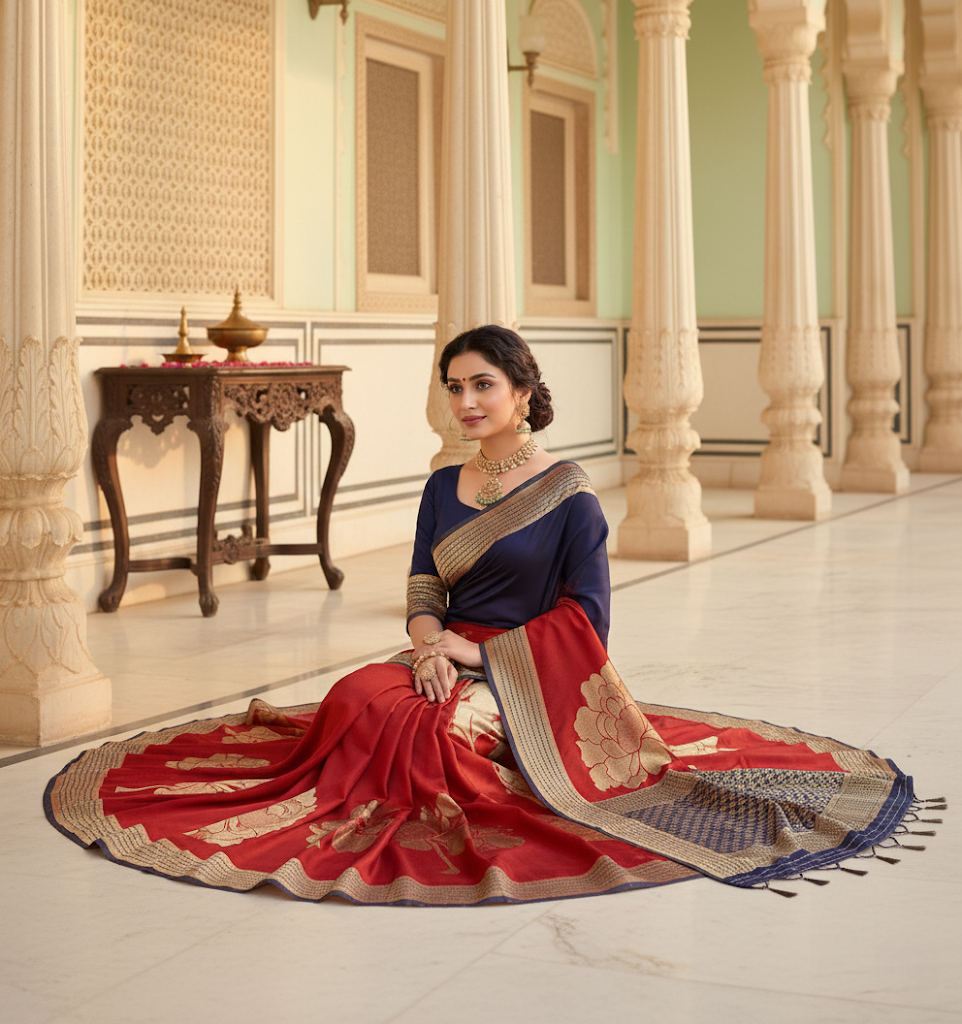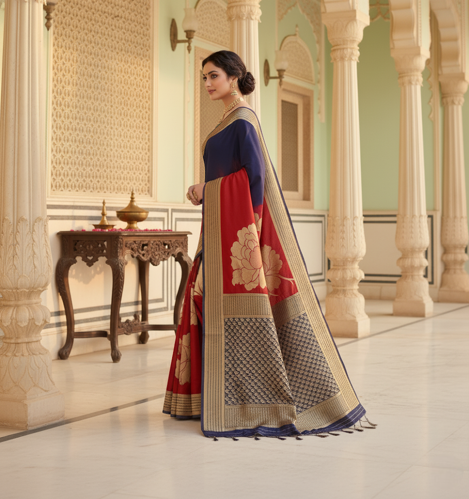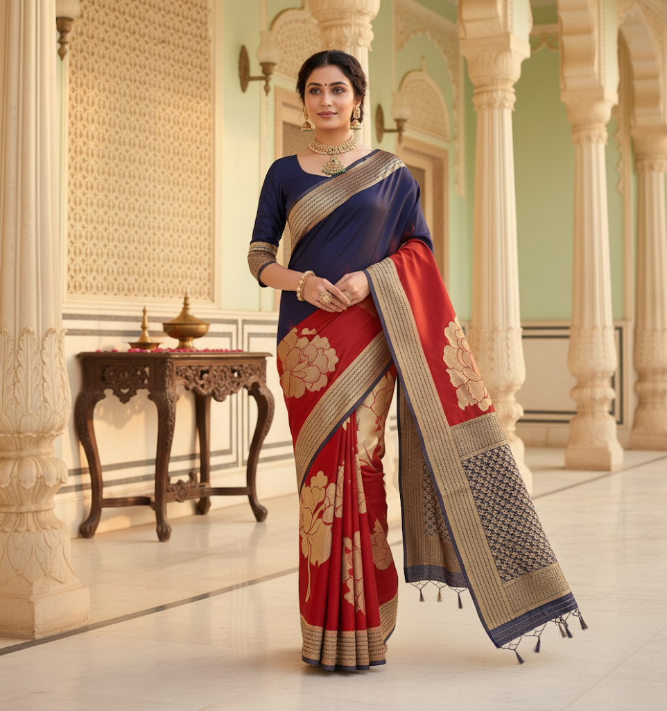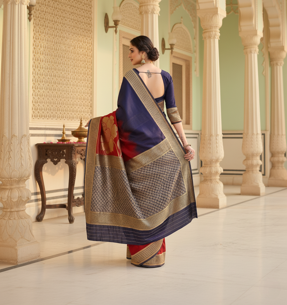 Navy Blue & Red Banarasi Silk Saree
