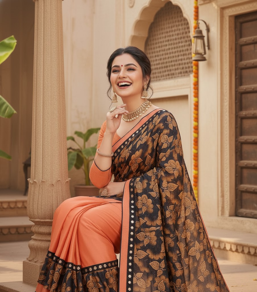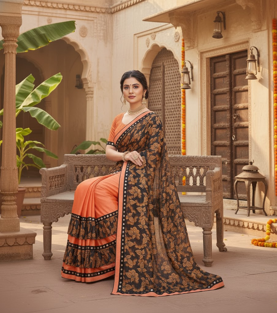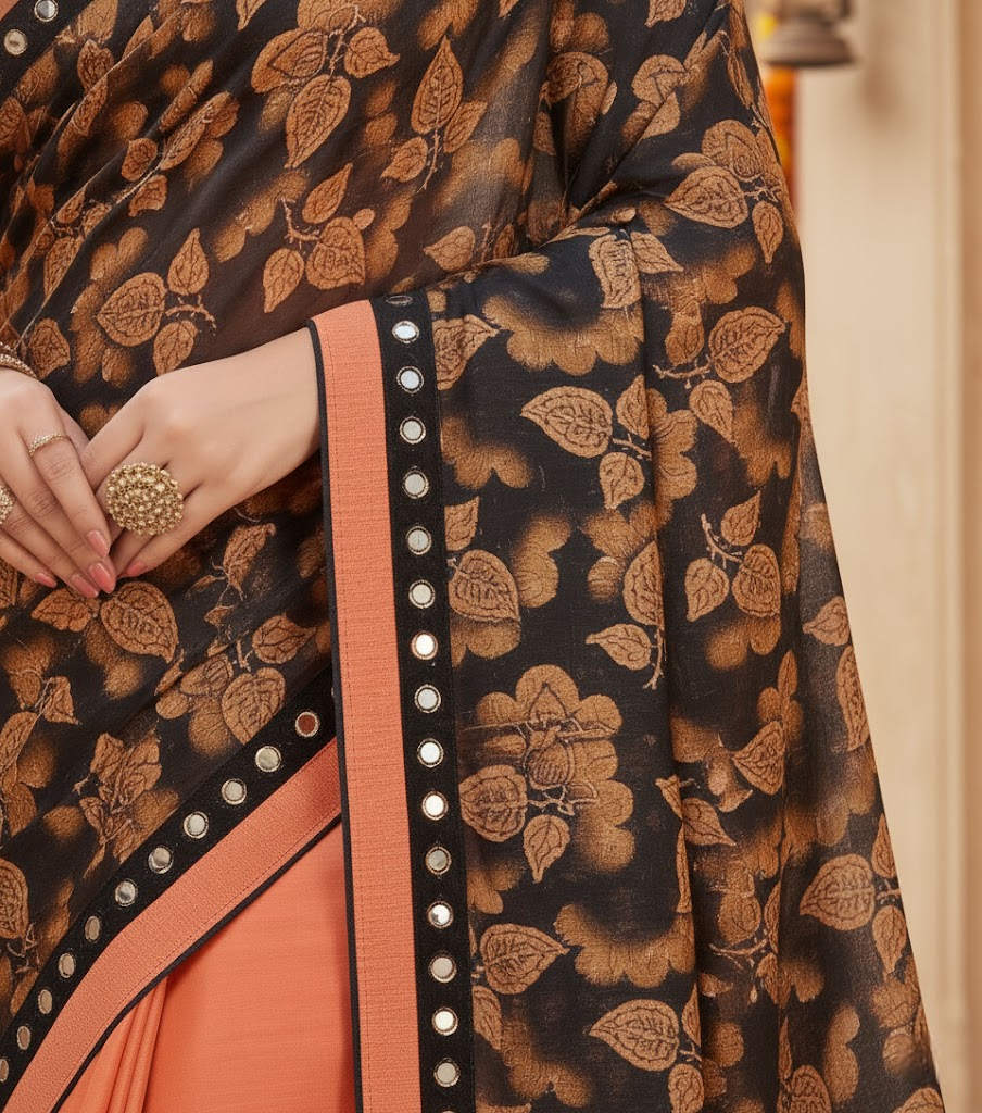 Saree Work: Elegant Floral Print with Mirror Work Border