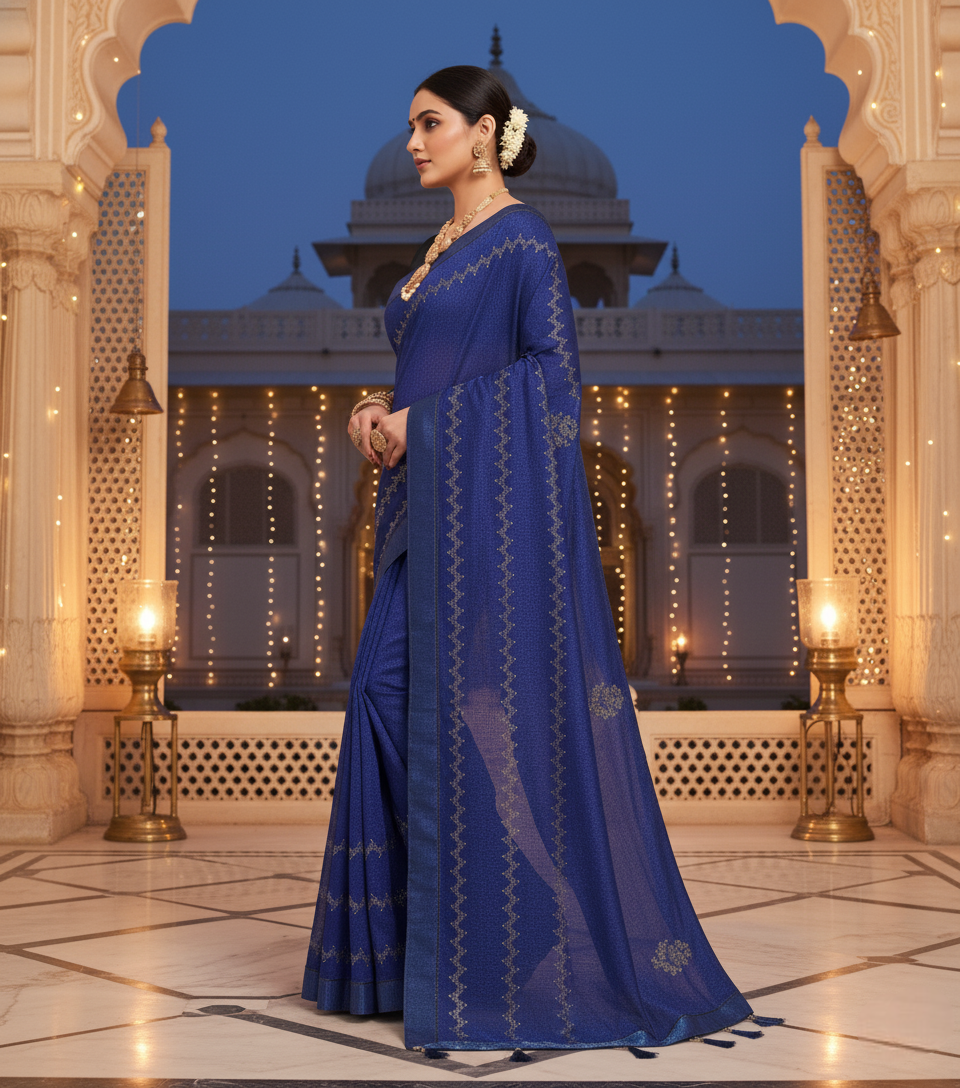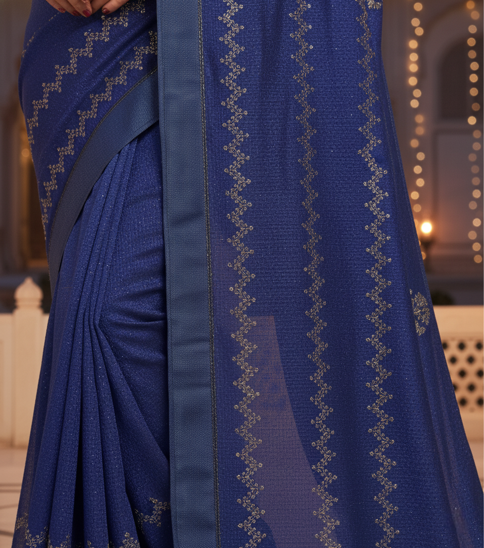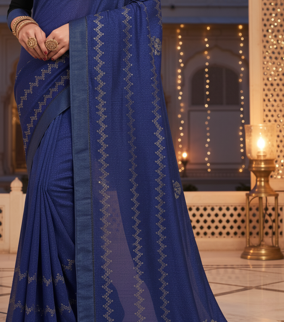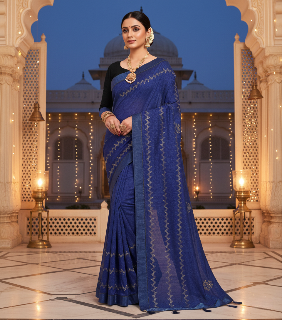 Blue Vichitra Silk Hotfix Stone Work Saree
