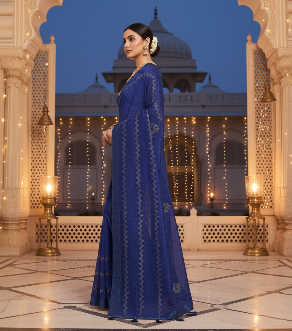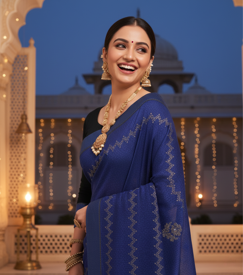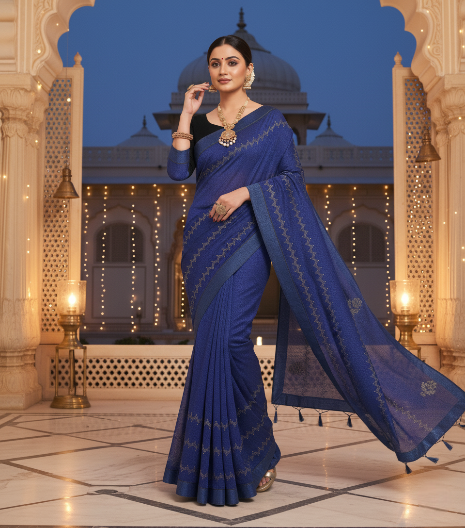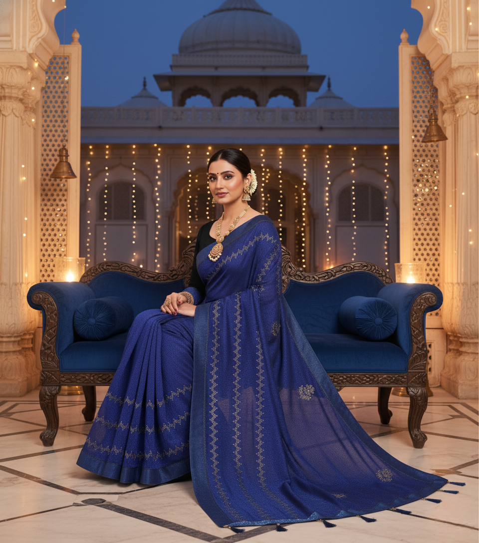Blue Vichitra Silk Hotfix Stone Work Saree